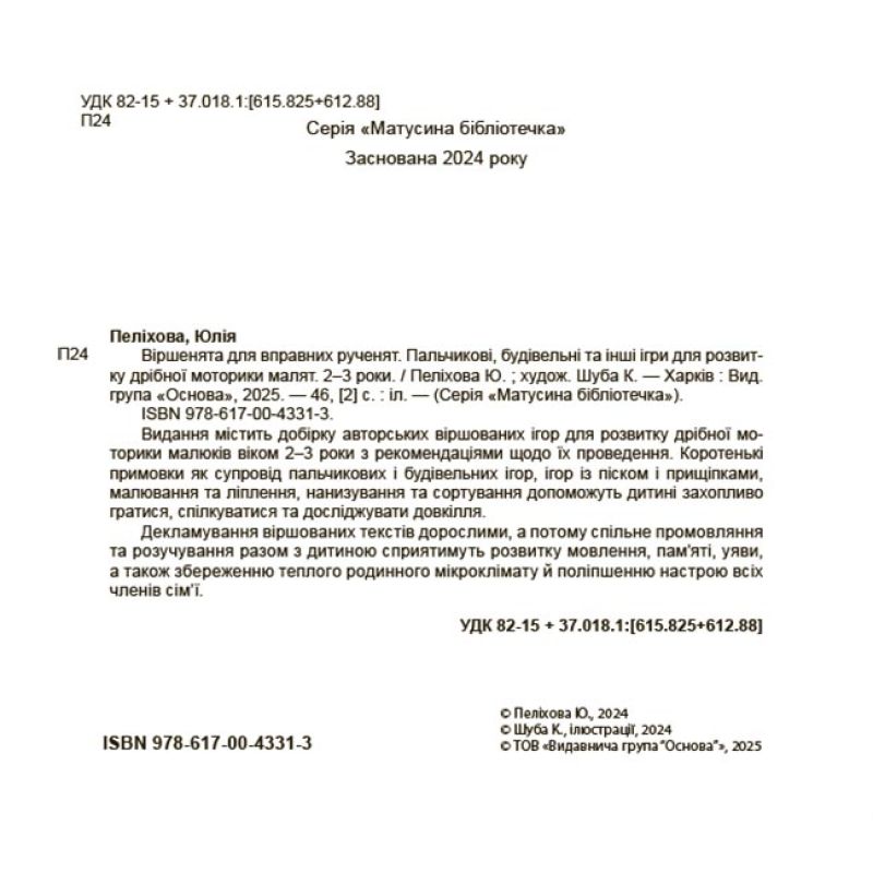 Благодаря удобному формату книги стихи всегда будут под рукой у мамы, сопровождая ее с малышом дома и во время прогулок, ожиданий в очереди, путешествий и тому подобное. «Стихи для умелых ручек» - это незабываемые мгновения теплого общения родителей с малышами. Пусть этих моментов будет как можно больше!