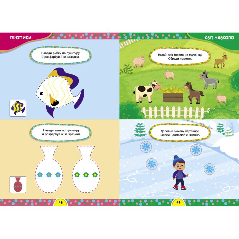 Тогда вам понравится книга «Годовой курс для детей 3+», которая соответствует программам дошкольного развития и содержит годовой курс для малышей от 3 лет. Издание охватывает четыре направления подготовки: логику, чтение, прописи и окружающий мир. Выполняя игровые задачи, ребенок разовьет логическое мышление, внимание и память; потренирует речевые навыки, выучит буквы и пополнит словарный запас; разовьет навыки мелкой моторики, раскрашивая и наводя контуры простых предметов, а также научится ориентироваться в пространстве и закрепит знания об овощах, фруктах, зверях, птицах и т.д.