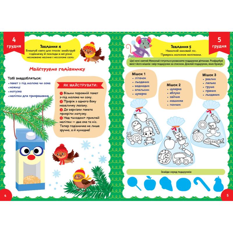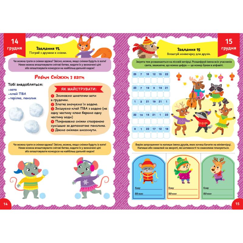 В ней малыш найдет множество интересных заданий для развития мышления и сообразительности: лабиринты, шифровки, ребусы, дорисовки и раскраски, путанки и загадки. Также в каждой книге есть увлекательные поделки и инструкции к их изготовлению, письмо святому Николаю и поздравительные открытки. В течение всего декабря малыш будет выполнять различные задания и с помощью наклеек вести отсчет дней до Нового года в ярком плакате-календаре, который нужно вынуть из книги и украсить им стену. Серия «Адвент-развивалка» поможет ребенку развить полезные навыки, подготовиться к главному зимнему празднику и подарит отличное настроение!