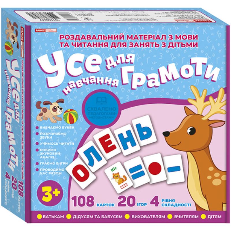 - Усе для навчання грамоти Роздавальний матеріал з мови та читання.До набору входять:3-6 лет.108 карток із твердого картон..