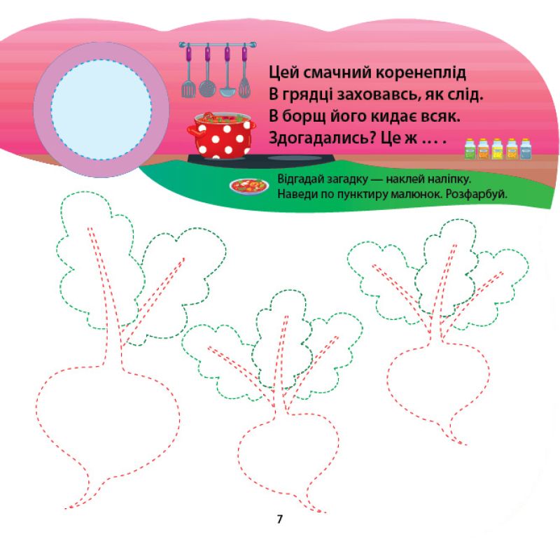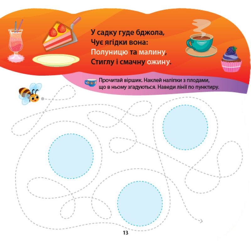 Книга «Овощи и фрукты» организует интересный и познавательный досуг для малышей, ведь содержит тематические загадки и стишки, переплетенные с простыми тренировочными прописями. Разгадав загадки об овощах и фруктах, ребенку нужно будет наклеить отгадки, навести их по пунктиру и раскрасить, украсив каждый рисунок наклейками. Интересные стишки расширят словарный запас малышей, потребуют память и внимание, потому что будут побуждать наклеить определенные предметы и дорисовать рисунки. Увлекательный игровой досуг будет воспитывать усидчивость, обеспечит хорошее настроение и развитие мелкой моторики пальцев рук.