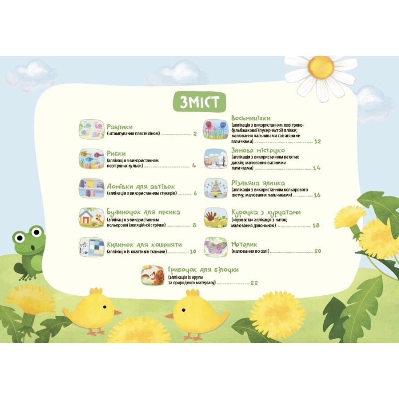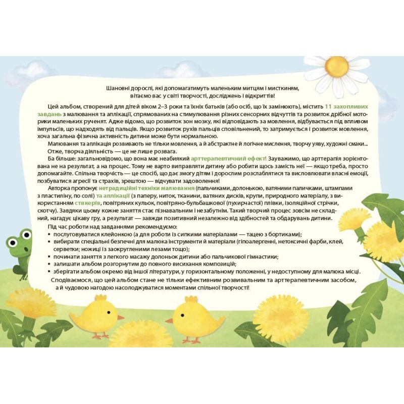 Альбом для творчества, созданный для детей 2–3 года, содержит 11 увлекательных задач по рисованию и аппликации для развития мелкой моторики маленьких ручонков, а также речи, мышления, воображения малышей.
