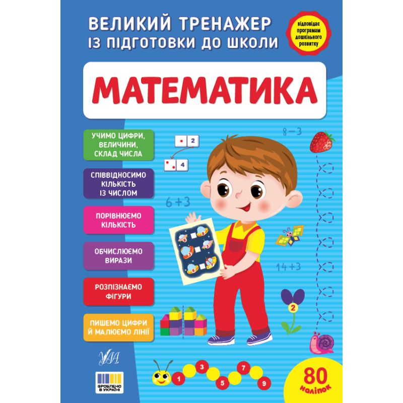 На страницах книги «Математика» ребенок познакомится с цифрами и знаками, потренируется их писать, поймет состав числа и понятия «больше» и «меньше»; будет вычислять выражения на сложение и вычитание в пределах 20, записывать числовые выражения по рисункам и рисовать иллюстрации к ним, а также научится различать формы, изучит их названия и потренируется их рисовать, поймет значение понятий «много – мало», «большой – маленький», «короткий – длинный». Издание содержит интересные игровые задачи, выполнение которых требует использования наклейок, рисования или записи ответов, что будет полезным для мелкой моторики, потренует внимание и память, разовьет воображение и логическое мышление, а также поможет ребенку качественно подготовиться к школе.