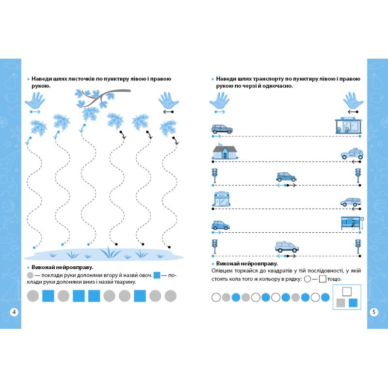 Тетрадь «Нейроупражнения» создана, чтобы помочь ребенку приобрести, развить и отработать навык красивого и аккуратного письма. В тетради ребенку предлагается нарисовать предметы по пунктирной линии, рисуя поочередно левой и правой рукой или одновременно обеими руками. Задания расположены по сложности и предполагают наведение мелких элементов и раскрашивание. После каждого задания ребенка ждет нейроупражнение, которое скоординирует работу полушарий головного мозга и синхронизирует работу глаз и рук.