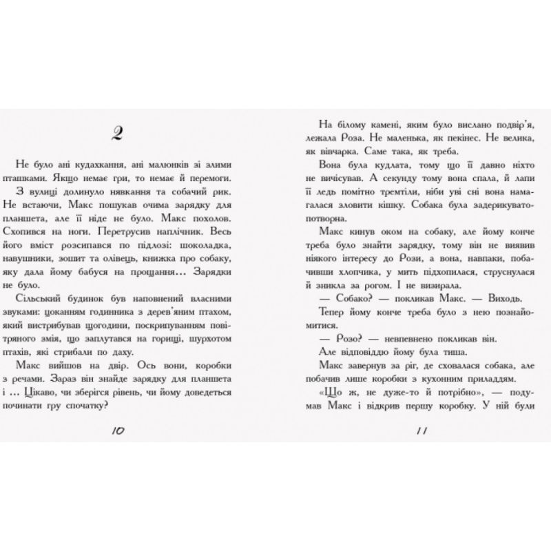 История городского мальчика, родители которого решили переехать в деревню. Макса ждет много неожиданностей, среди них — пес по имени Роза, которого покинули бывшие хозяева дома. Пока у Макса есть планшет, его ничто и никто не интересует, но вдруг экран угасает, а зарядное забыли в городе… Макс хорошо умеет играть, но не очень понимает, как обращаться с собаками. Как сложатся отношения Макса и Розы и кто победит: компьютерная игра или природа? Издание для детей младшего школьного возраста и взрослых.