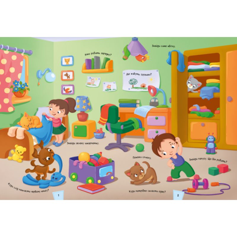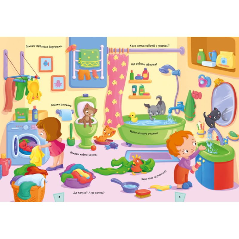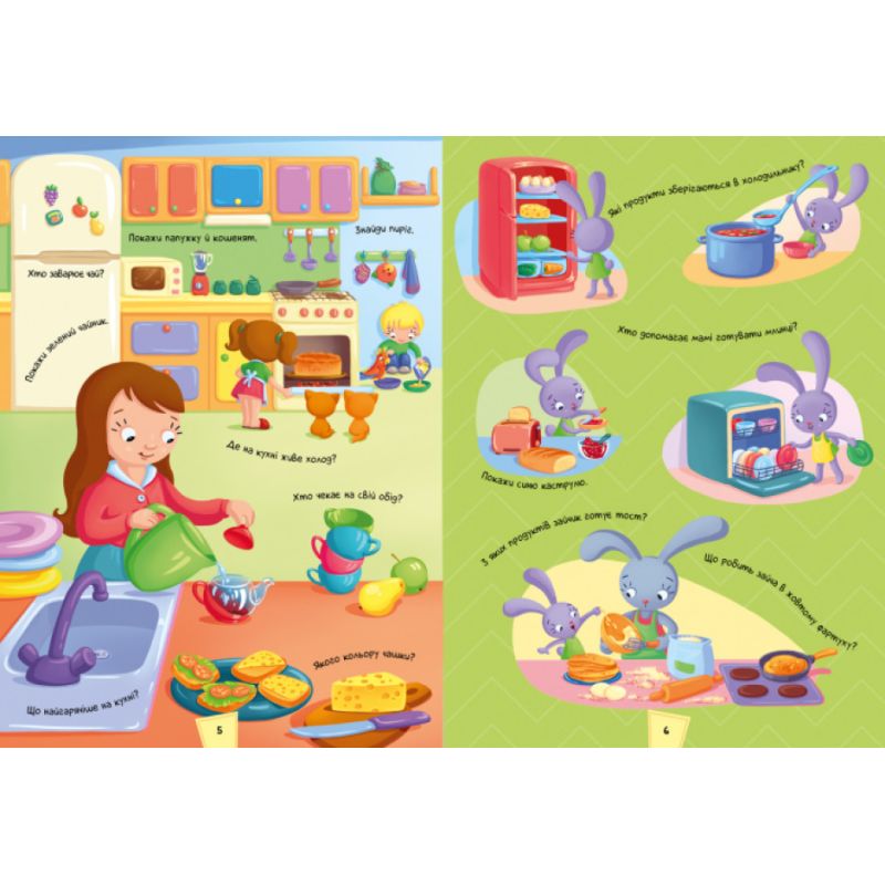 Открывая книгу, малыш заглянет в комнаты домов, рассмотрит, чем занимаются хозяева. Ребенок познакомится с разной мебелью, одеждой, едой, бытовой техникой и другими принадлежностями. Малыш сможет угадывать названия комнат, давать имена жителям и домашним животным. А также придумывать о них истории. Забавный вымельбух большие яркие предметы, смешные ситуации, интересные вопросы. Все это поможет потренировать внимательность и узнать что-то новое.