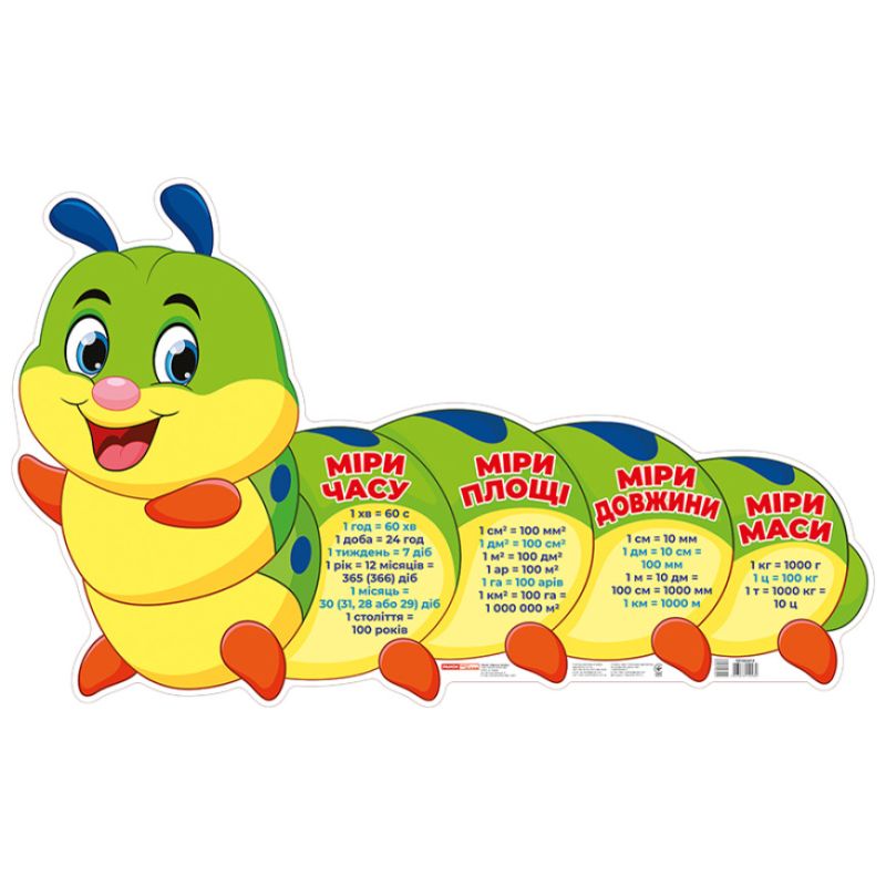 Плакат для оформления интерьера помещения в начальных школах по программе новой украинской школы «Гусеница. Единицы измерения» поможет детям легко изучить и запомнить единицы измерения. Яркий плакат с фигурной вырубкой в виде забавной гусеницы. Яркая печать и интересный дизайн наглядности привлекут внимание каждого ребенка и станут надежными. помощником во время учебы.