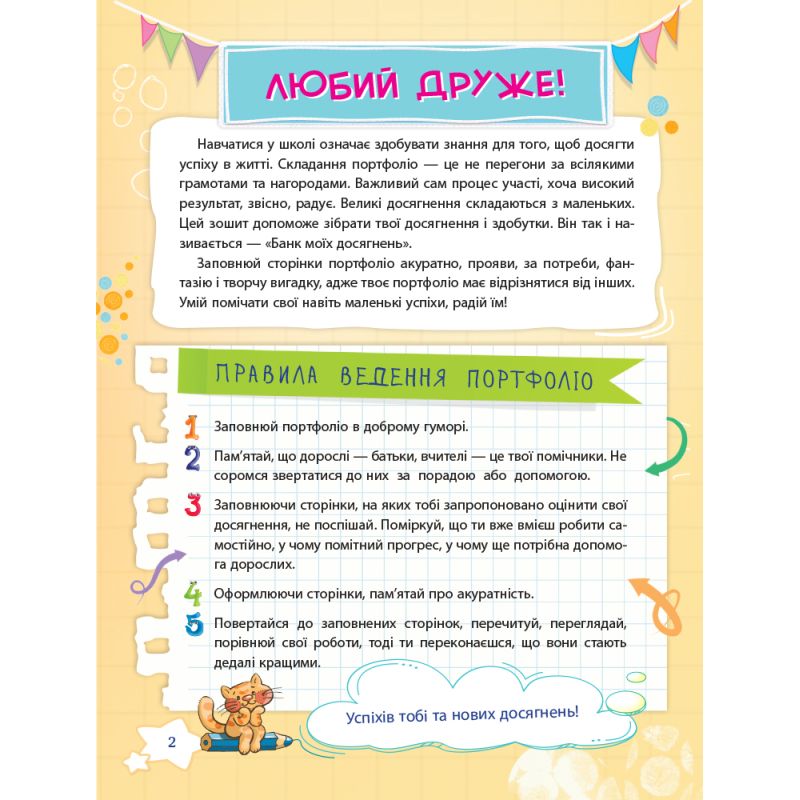 Портфолио ученика – это один из современных способов оценивания школьника. Учиться в школе означает обретать знания, приобретать умения и навыки для того, чтобы добиться успеха. Задача в тетради подобрана так, чтобы формировать у детей умение видеть взаимосвязи многих аспектов жизни. Согласно философии Концепции Новой украинской школы, это в конечном счете станет привычкой, которая будет помогать ребенку в будущем. Благодаря этой тетради можно собрать достижения и достижения, записывать успехи и сохранить о них добрую память.