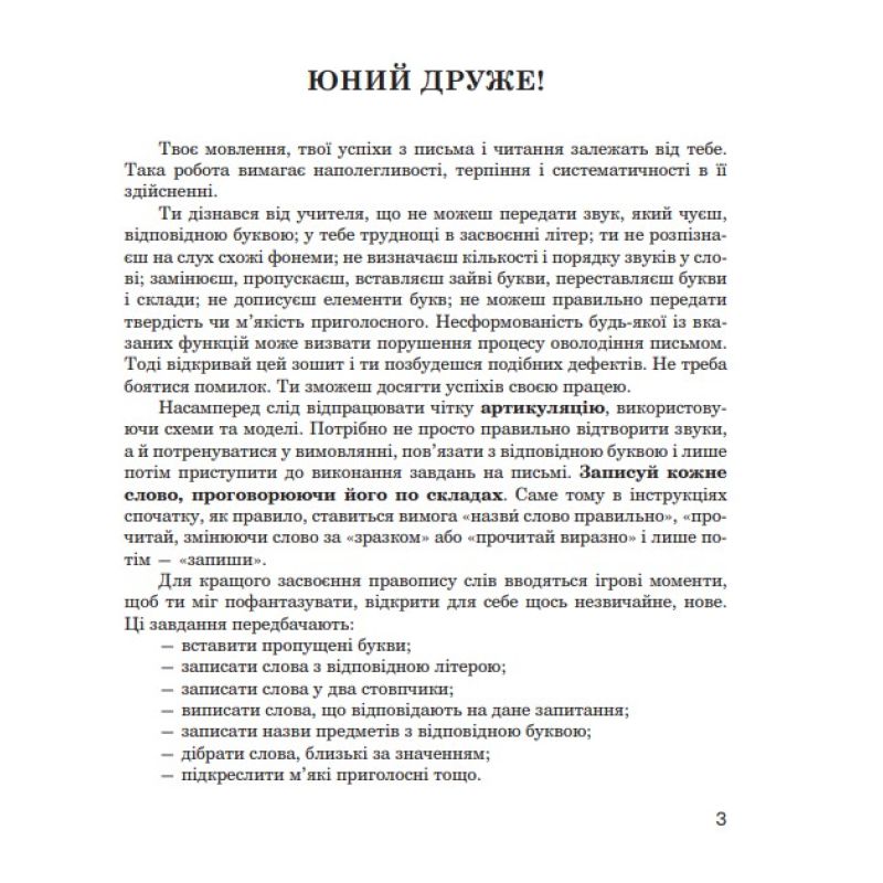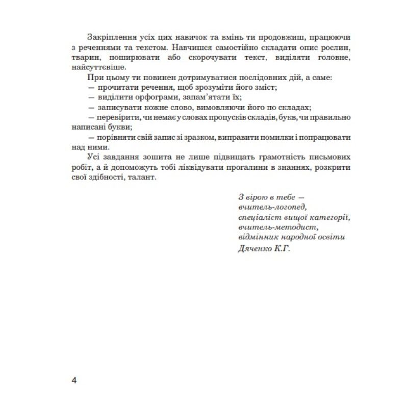 Логопедическая тетрадь заключена по руководству К.Г. Дяченко «Инновации в коррекции письменной речи младших школьников», чтобы помочь учащимся преодолеть изъяны письменной речи. В данном руководстве представлена система задач с учетом дифференцированного подхода для устранения изъянов письменной речи у учащихся 2-4 классов общеобразовательной школы.