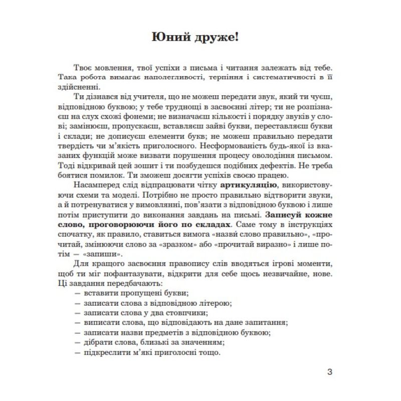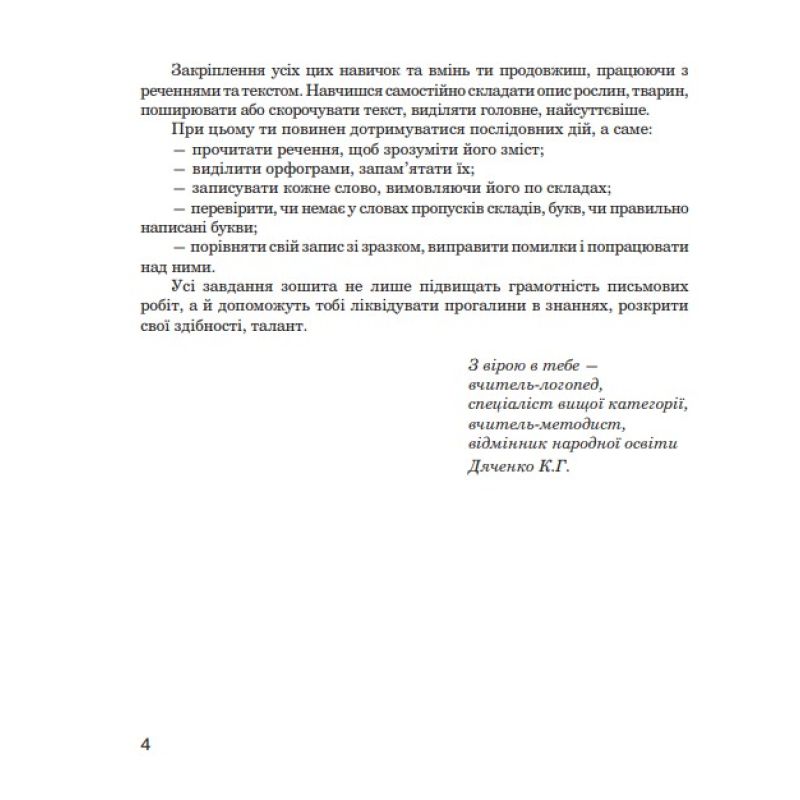 Логопедическая тетрадь заключена по руководству К.Г. Дяченко «Инновации в коррекции письменной речи младших школьников», чтобы помочь учащимся преодолеть изъяны письменной речи. В данном руководстве представлена система задач с учетом дифференцированного подхода для устранения изъянов письменной речи у учащихся 2-4 классов общеобразовательной школы.