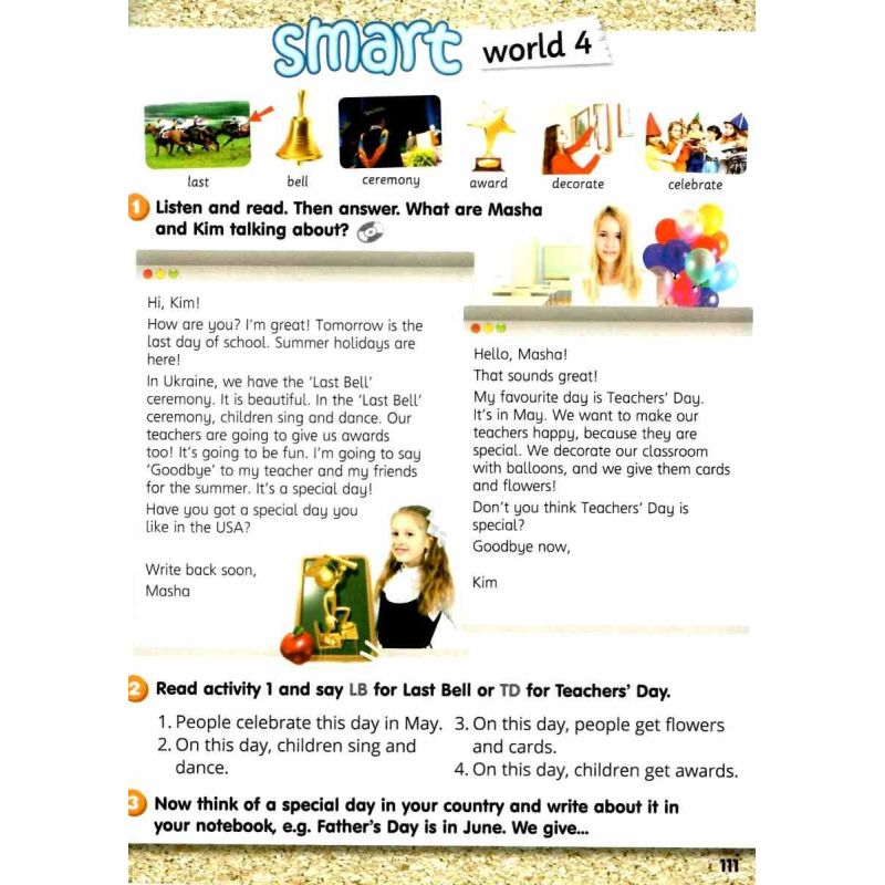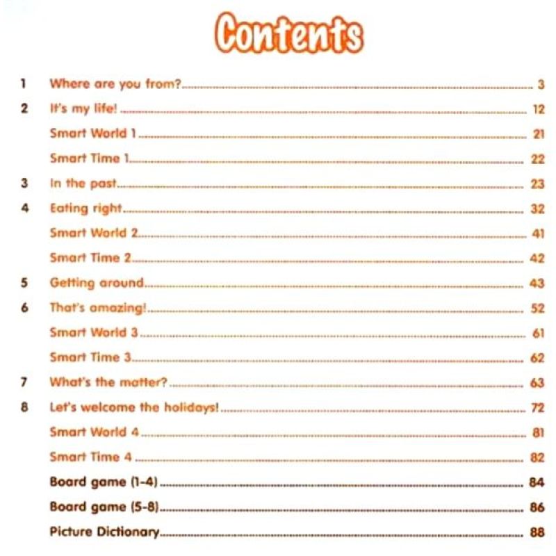 Student’s Book – підручник, що складається з 8 модулів. У кожному юніті 6 уроків, а також сторінки Smart World (міжкультурні зв’язки), Smart Time (міжпредметні зв’язки), секція на повторення Revision та Now I can – самооцінювання досягнень.