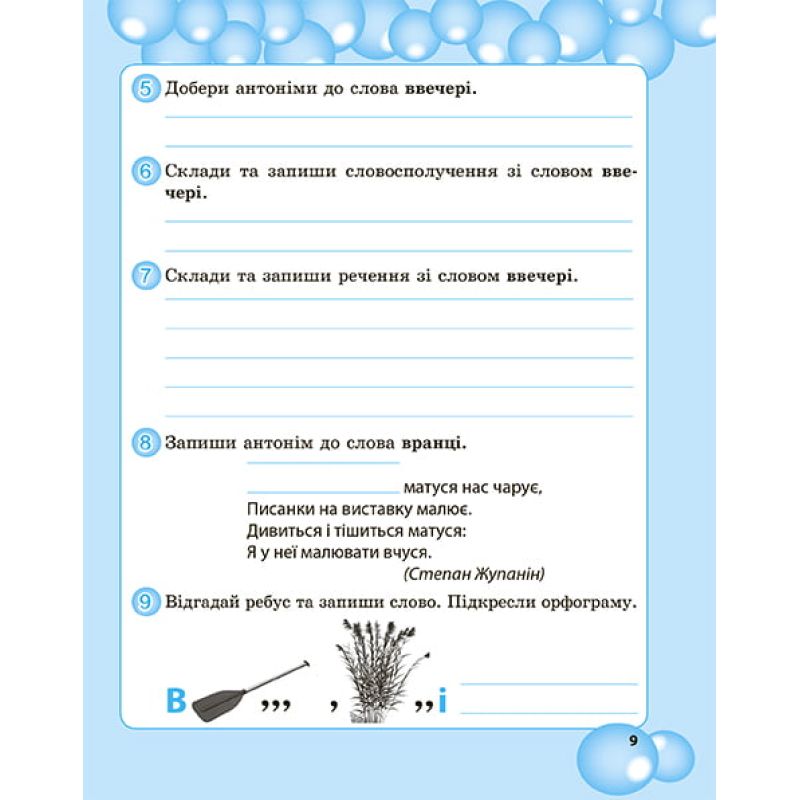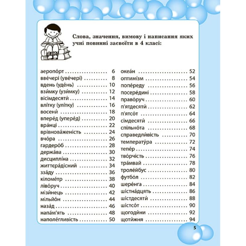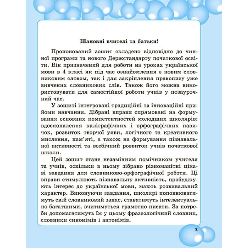 Пособие содержит упражнения направленые на совершенствование каллиграфических и орфографических навыков, развитие творческого внимания, логического и креативного мышления (составление «ассоциативного куста» к словарного слова, толкование слова, отгадывание загадки, подбор синонимов, пословиц, фразеологизмов и т.д.).