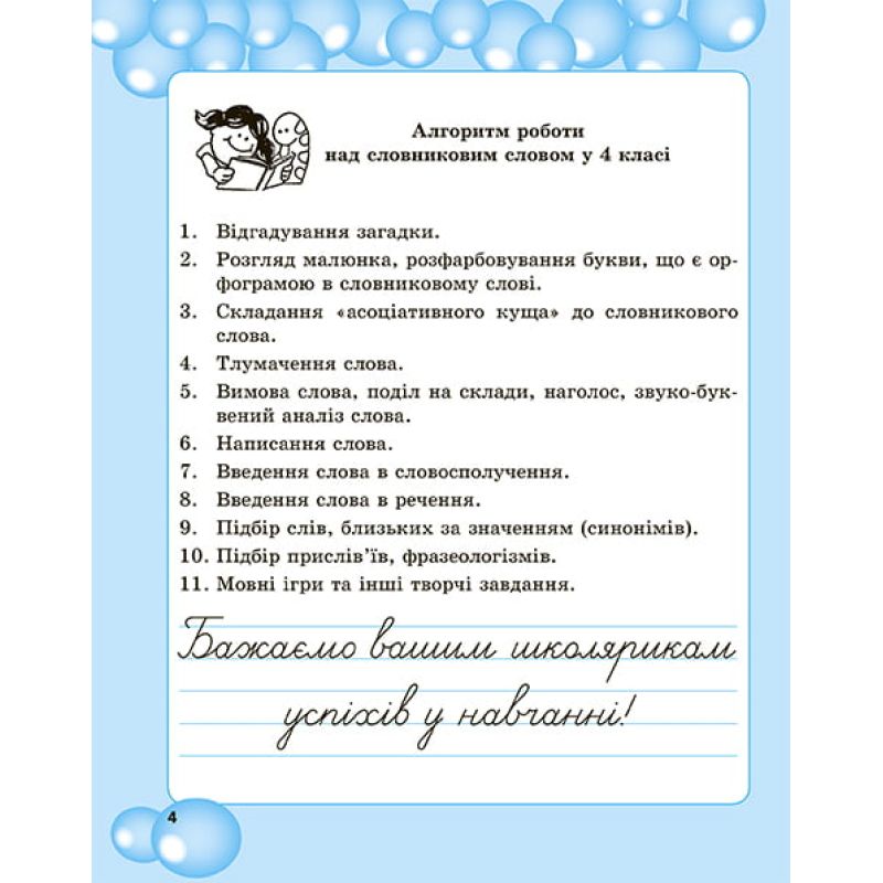 Издание «Работа над словарными словами в 4 классе» составлено в соответствии с программами Новой украинской школы, утвержденными приказом № 268 от 21.03.2018 г. (Типовые образовательные программы под руководством А. Я. Савченко и Р. Б. Шияна). Издание предлагает алгоритм работы над словарными словами, который пригодится учителю при подготовке к уроку по украинскому языку.