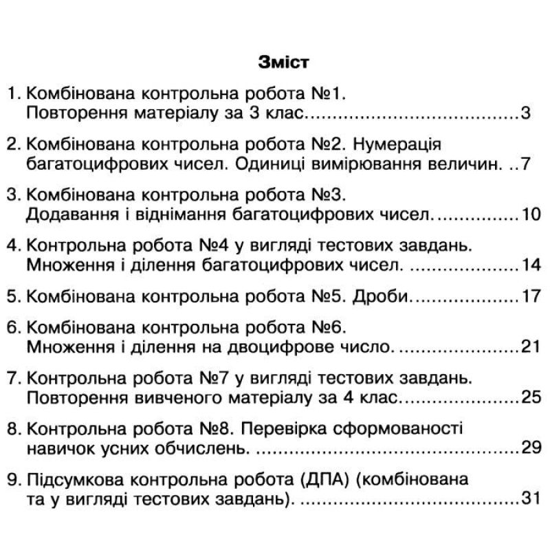 В тетради предложено 8 тематических диагностических работ, по 2 варианта в каждой, и одна итоговая (Государственная итоговая аттестация), содержание которых соответствует Государственному стандарту начального образования, Типовым образовательным программам по математике для учащихся 4 класса.