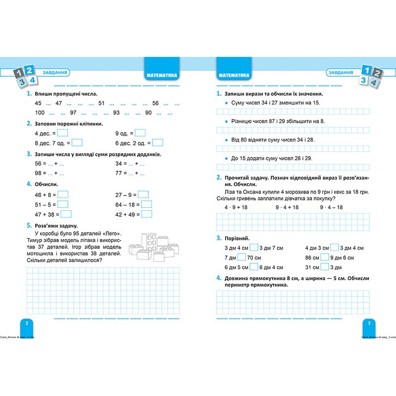 Книга предназначена для совершенствования учениками начальных классов приобретенных во время обучения умений и навыков по математике, украинскому и английскому языкам. Тренажер содержит большое количество упражнений по основным темам школьного курса 3 класса.