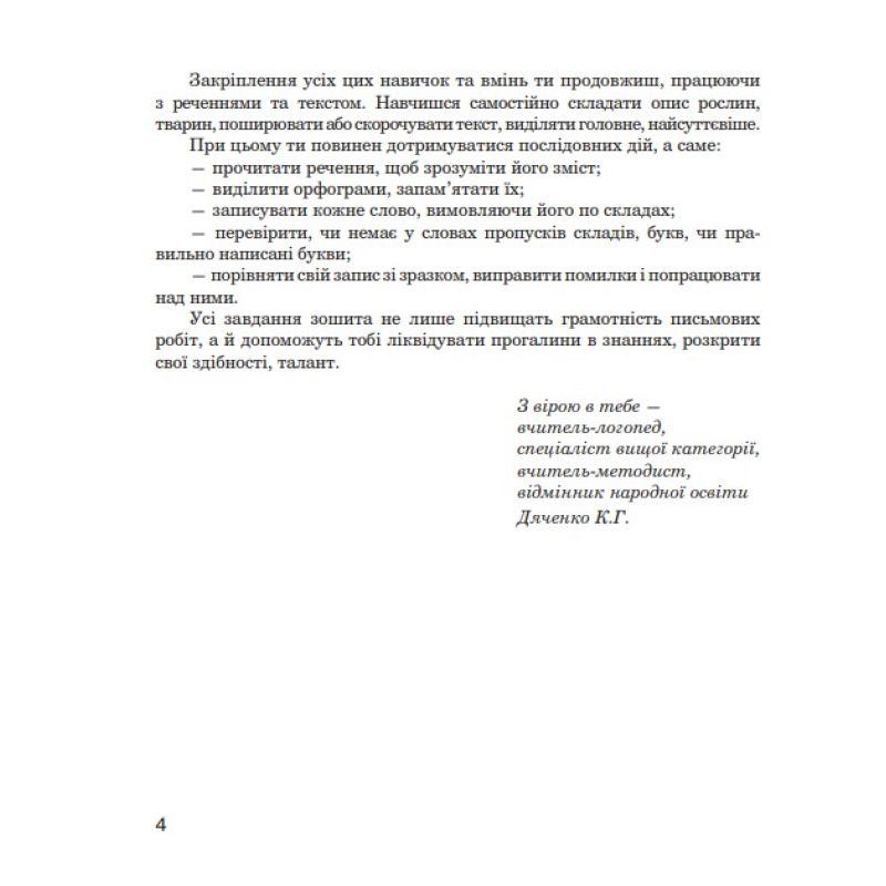 Логопедическая тетрадь заключена по руководству К.Г. Дяченко «Инновации в коррекции письменной речи младших школьников», чтобы помочь учащимся преодолеть изъяны письменной речи. В данном руководстве представлена система задач с учетом дифференцированного подхода для устранения изъянов письменной речи у учащихся 2-4 классов общеобразовательной школы.