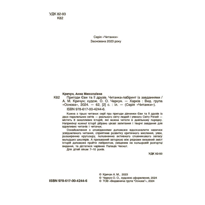 Серия книг о приключениях Евы пригодится детям в возрасте 7–10 лет, чтобы усовершенствовать навыки осознанного чтения; будет способствовать развитию критического мышления, воображения, расширению кругозора, пополнению активного словарного запаса. А скрытое автором между строками воспитательное содержание историй поможет пройти лабиринтом, помещенным на цветном развороте издания, и добраться до волшебных Дворцов Добродетелей.