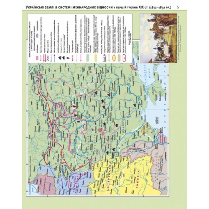 Среди интересов Атласа истории Украины для 9 класса – карта «Украина в планах декабристов», карты, освещающие связь украинского национально-освободительного движения с «Весной народов» в Европе, планы Киева и Львова в XIX в. По карте «Хозяйство в первой половине ХІХ ст.» можно определить экономический «вес» городов в рублях. Значительно углублено содержание карты «Западноукраинские земли во второй половине ХІХ – начале ХХ ст.» (Показаны результаты выборов в австрийский Рейхсрат в 1897 г., районы влияния народовцев и москвофилов и т.п.). Широко освещена тема революции 1905 г., Столыпинской реформы и переселенческого движения, национального возрождения, в частности, появление и развитие украинской прессы.