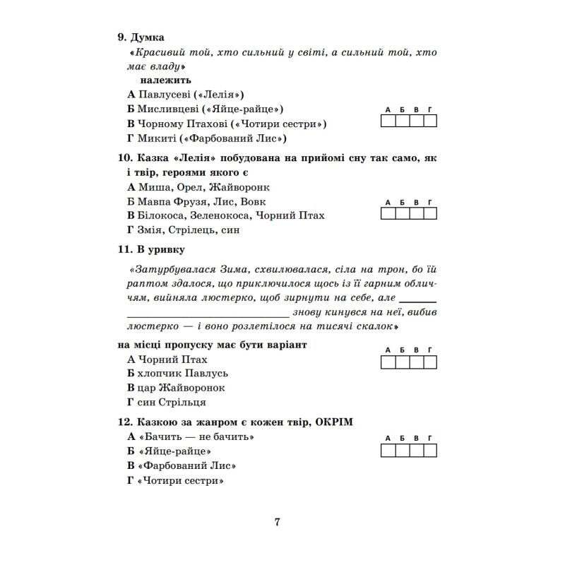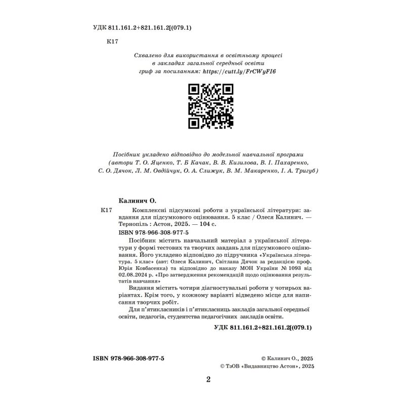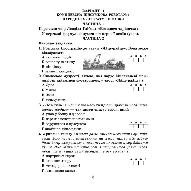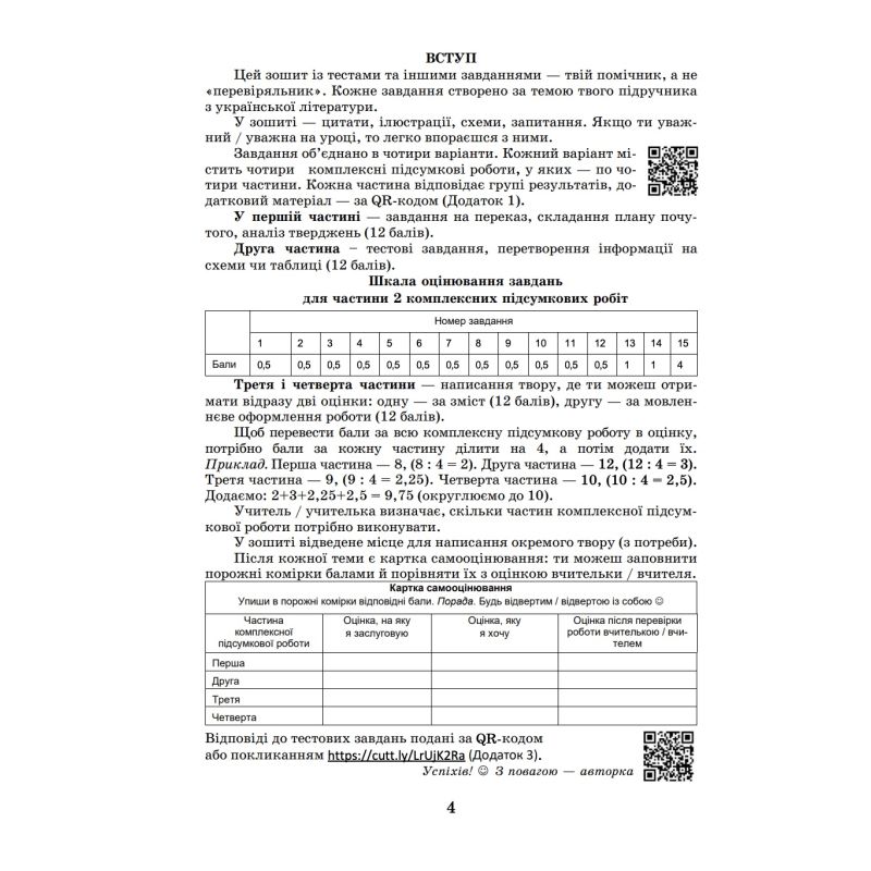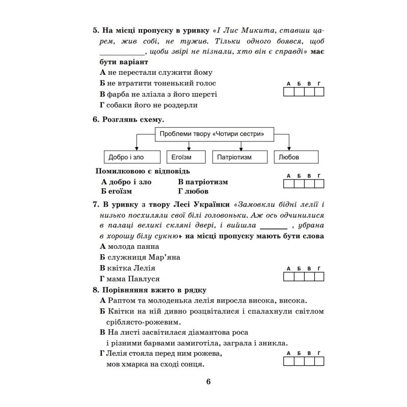 Пособие содержит учебный материал украинской литературы в форме тестовых и творческих задач для итогового оценивания. Он составлен в соответствии с учебником «Украинская литература. 5 класс» (авт: Олеся Калинич, Светлана Дячок под редакцией проф. Юрия Ковбасенко) и в соответствии с приказом МОН Украины № 1093 от 02.08.2024 г. «Об утверждении рекомендаций по оценке результатов обучения»