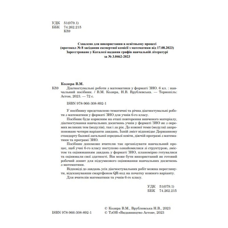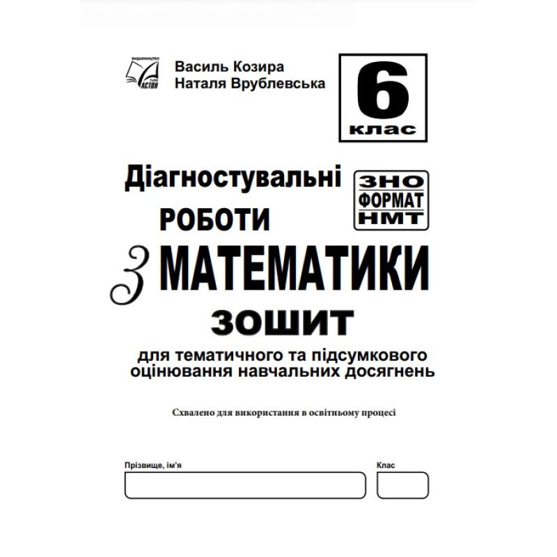 Диагностические работы по математике в формате ЗНО. 6 класс: учебное пособие. Козыра В., Врублевская Н.