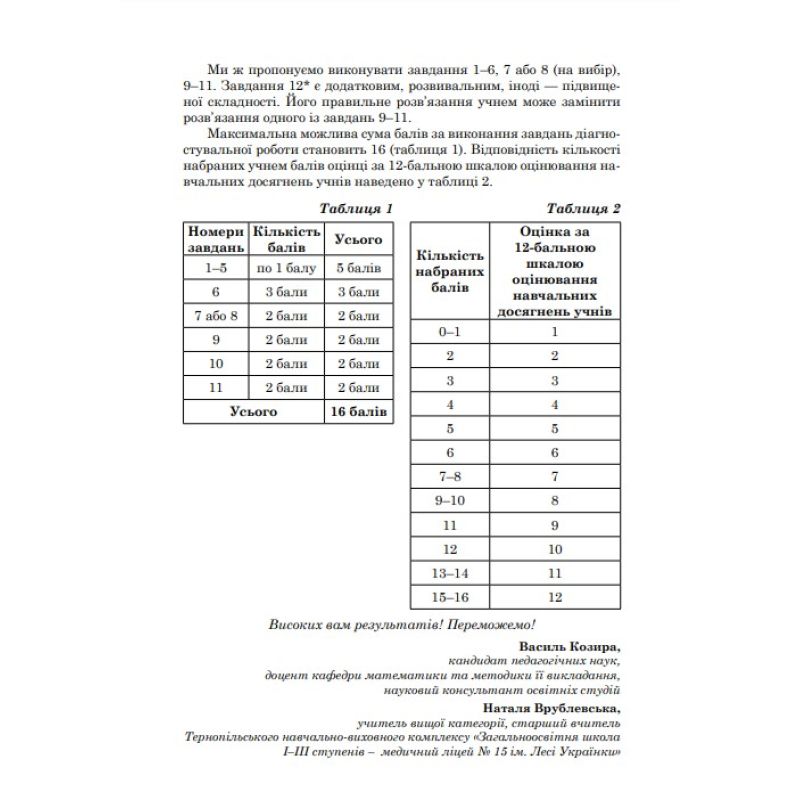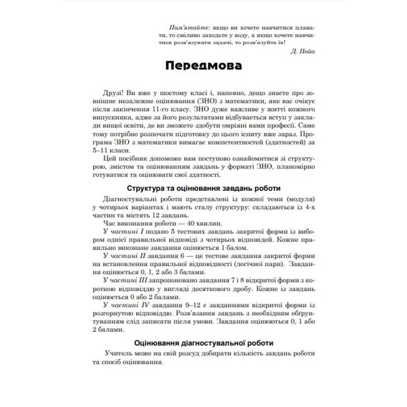 Руководство поможет учителю так организовать учебный процесс, чтобы учащиеся 6-го класса постепенно ознакомились со структурой, содержанием и оценкой задач в формате ЗНО, планомерно готовились и оценивали свои способности. Он может быть использован как готовая рабочая тетрадь для итоговой оценки учебных достижений по математике.