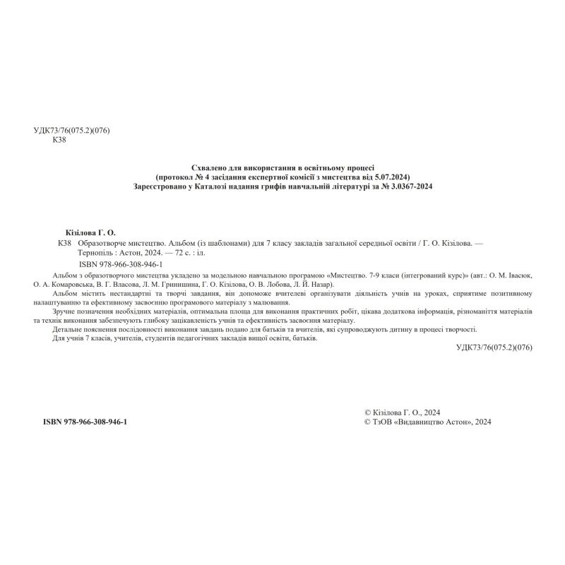 Альбом по изобразительному искусству составлен по модельной учебной программе «Искусство. 7-9 классы (интегрированный курс)» (авт.: О. М. Ивасюк, О. А. Комаровская, В. Г. Власова, Л. М. Гринишина, Г. А. Кизилова, О. В. Лобова, Л. И. Назар).