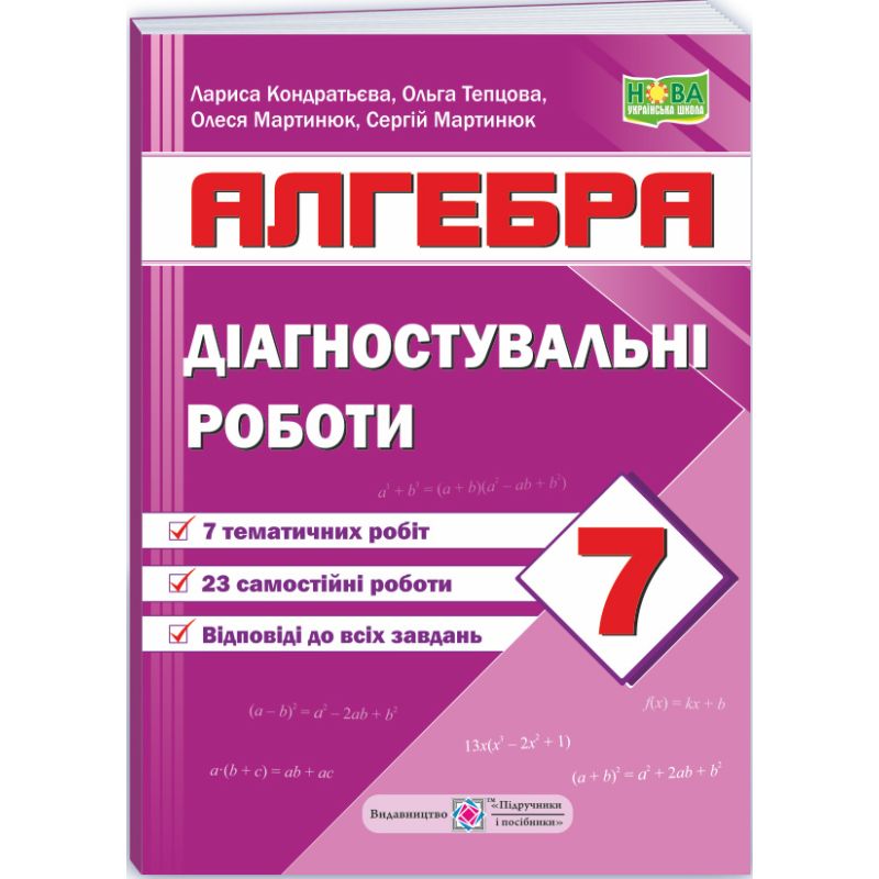 Руководство предназначено для диагностирования учебных достижений учащихся 7 класса заведений общего среднего образования. Он соответствует модельной обучающей программе «Алгебра. 7–9 классы» (авт. А. Г. Мерзляк и др.).