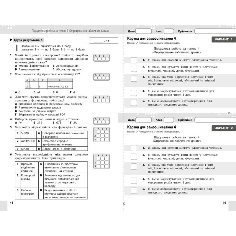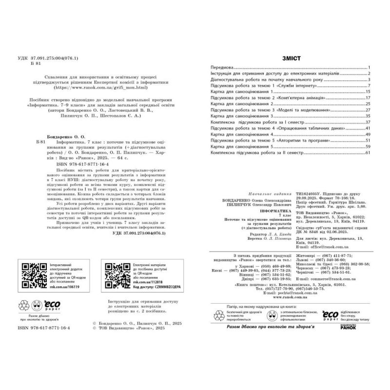 Пособие содержит работы для критериально-ориентированного оценивания по группам результатов по информатике в 7 классе НУШ: диагностическую работу в начале года, итоговые работы по темам, комплексные итоговые работы (за I и II семестры), а также карточки для самооценивания. Каждая работа состоит из четырех блоков заданий, которые охватывают четыре группы результатов обучения. Второй вариант диагностической работы, комплексных итоговых работ за семестр и текущие интерактивные работы по группам результатов доступны по QR-коду или ссылке.