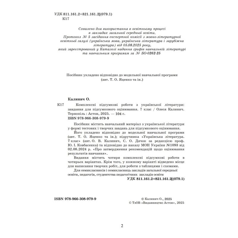 Он заключен в соответствии с модельной учебной программой (авт. Т. А. Яценко и др.); учебника «Украинская литература. 7 класс» (авт. А. В. Калинич, С. А. Дьячок под редакцией проф. Ю. И. Ковбасенко) и в соответствии с приказом МОН Украины №1093 от 02.08.2024 г. «Об утверждении рекомендаций по оценке результатов обучения».
