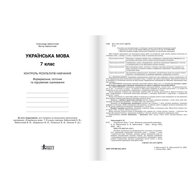 НУШ Контроль результатов обучения Літера Украинский язык 7 класс + Оценка по группам результатов. Заболотный (2025 год) издательства Літера можно купить в интернет-магазине Книгован со скидкой или с бесплатной доставкой по Украине.