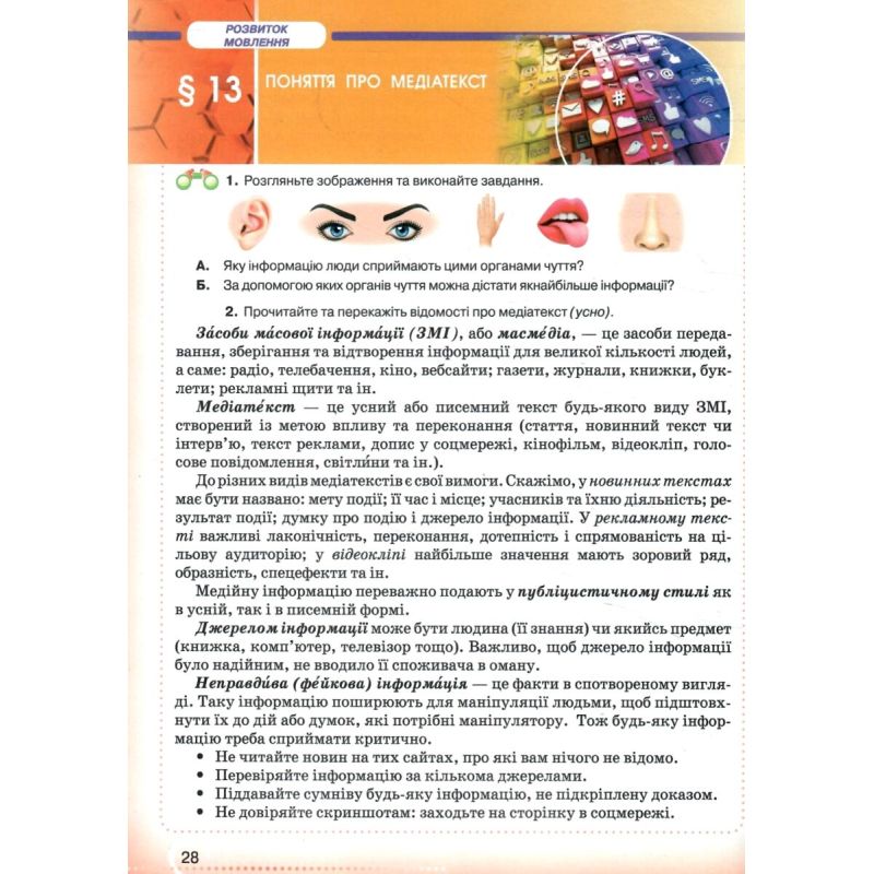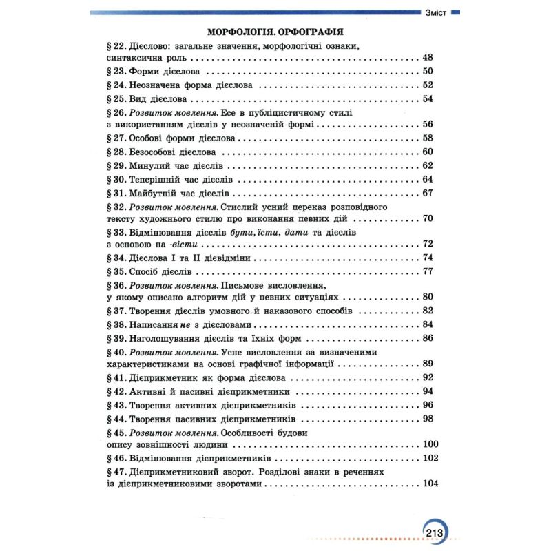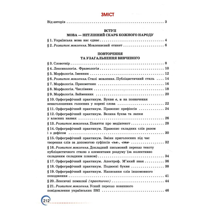 В учебнике приведены материалы для повторения и обобщения изученного в предыдущих классах, а также разделы «Морфология. Орфография» и «Обобщение и систематизация изученного» (по Модельной обучающей программе «Украинский язык. 7–9 классы: для заведений общего среднего образования» (авт. коллектив: О. В. Заболотный, В. В. Заболотный, В. П. Лавринчук, К. В. Пливачук, Т. Д. Попова).