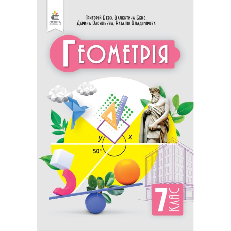 Учебник по геометрии для 7 класса, составленный по программе НУШ 2024, автор Бевз. Содержание учебника и аппарат организации его усвоения направлены также на творческое развитие учащихся, мотивацию обучения, стимулирование познавательного интереса, обеспечение успешной самостоятельной работы учащихся. Решение большинства типичных сюжетных задач представлено алгебраическим способом. Задачи для различных видов классной и внеклассной работы, в том числе практического направления, даны после каждого параграфа, они имеют сквозную нумерацию.