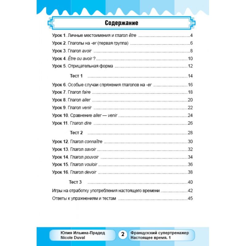 Этот тренажер призван помочь ребенку научиться правильно употреблять глаголы настоящего времени французского языка. Тренажер основан на простейшей лексике, знакомой ученикам начального уровня обучения. В нем предлагается множество разнотипных упражнений на отработку спряжения глаголов первой группы, а также наиболее распространенных неправильных глаголов. Весь материал книги разбит на 16 уроков, каждый из которых посвящен отдельной микротеме.