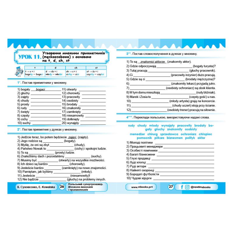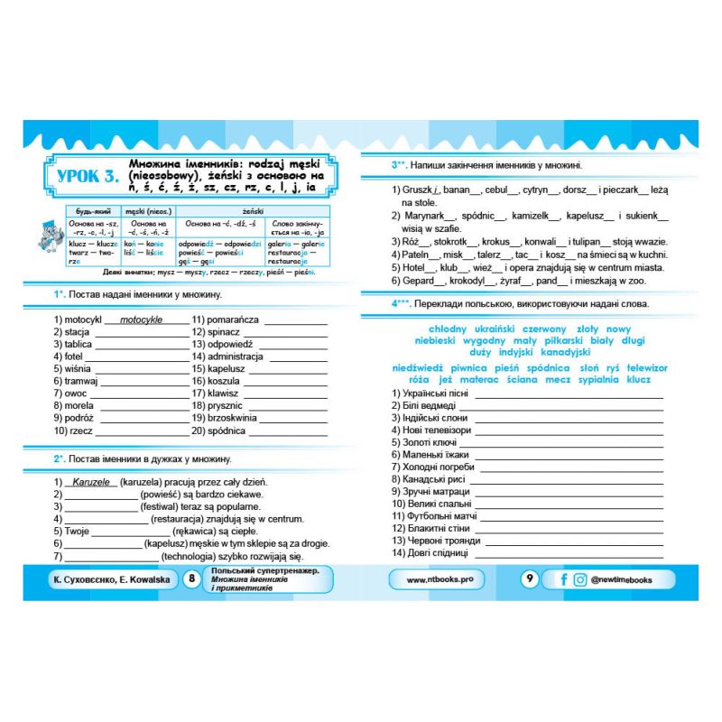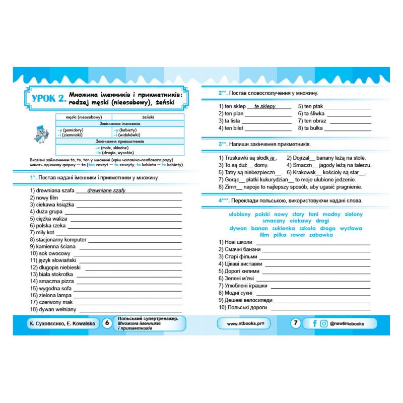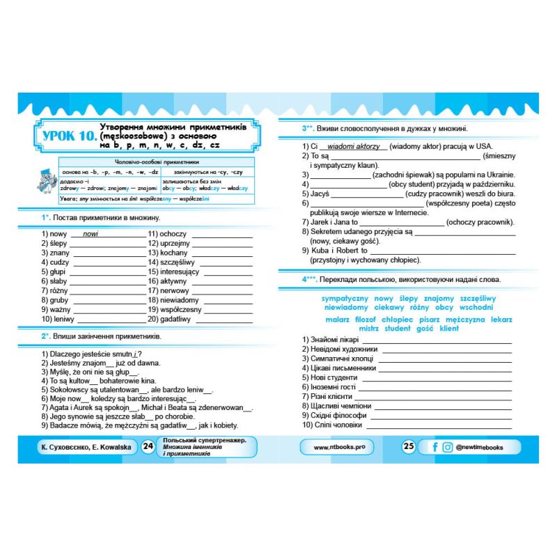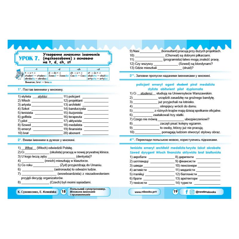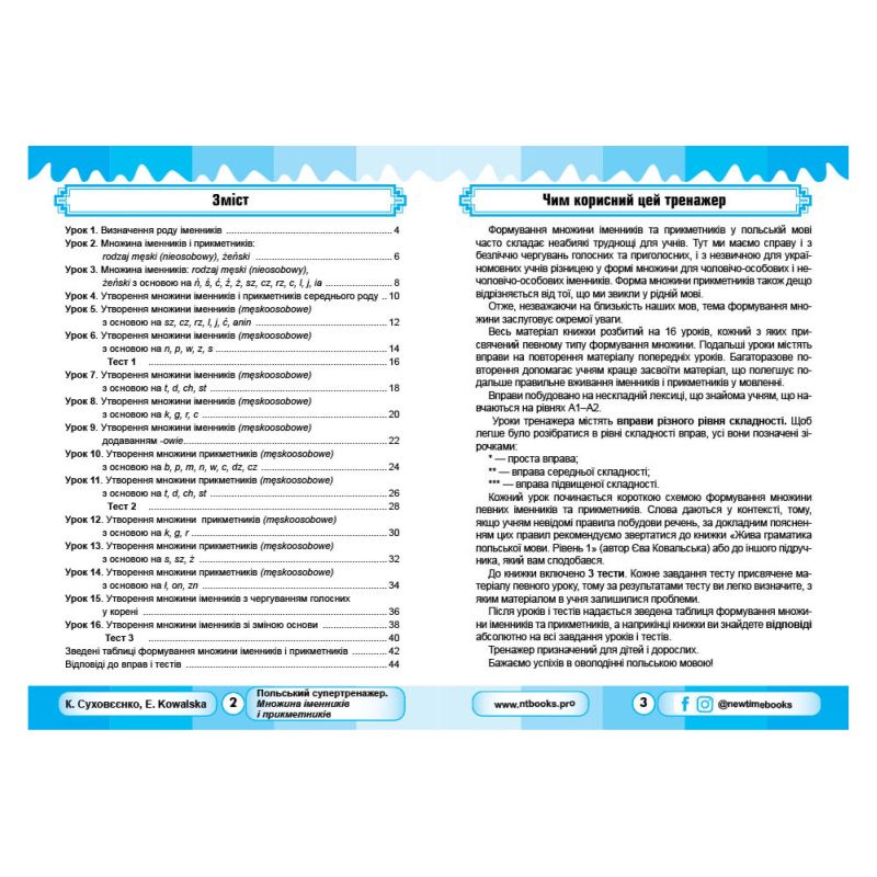 Весь материал книги "Польский супертренажер. Множество существительных и прилагательных" разбит на 16 уроков, каждый из которых посвящен определенному типу формирования множества польских существительных или прилагательных. Дальнейшие уроки содержат упражнения для повторения материала предыдущих уроков. Многократное повторение помогает учащимся лучше усвоить материал, что облегчает дальнейшее правильное употребление существительных и прилагательных в речи.