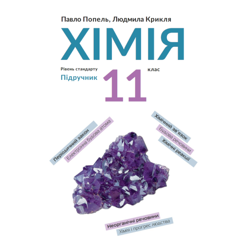Учебник подготовлен по учебной программе по химии для 11 класса заведений общего среднего образования (уровень стандарта). В нем обобщены содержание периодического закона, строение атомов и ионов, типы химической связи и химических реакций, рассмотрен состав, строение, свойства и применение важнейших простых веществ и неорганических соединений. Содержит практические работы, лабораторные опыты, упражнения, задачи, дополнительный материал для любознательных, а также словарь химических терминов, предметный указатель, список литературы для учащихся и интернет-сайтов с интересным материалом по химии.