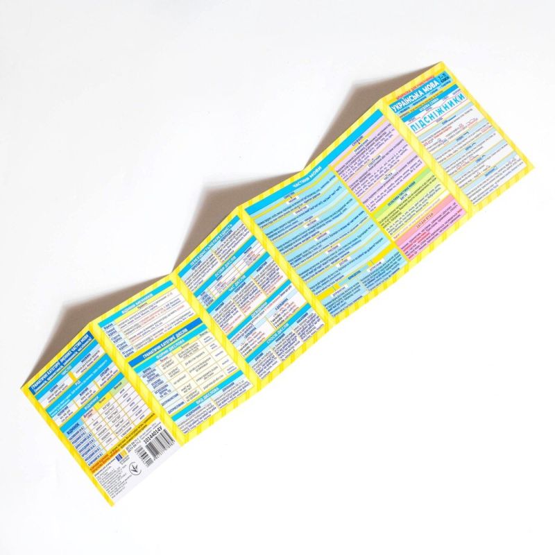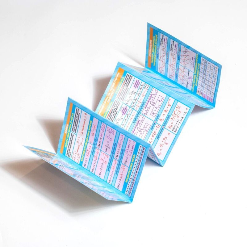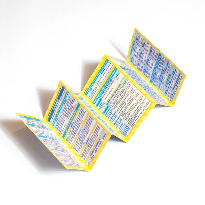 Складывается гармошкой, имеет 5 перфораций, напечатана на плотной мелованной бумаге с глянцевой ламинацией — не боится влаги и загрязнений.