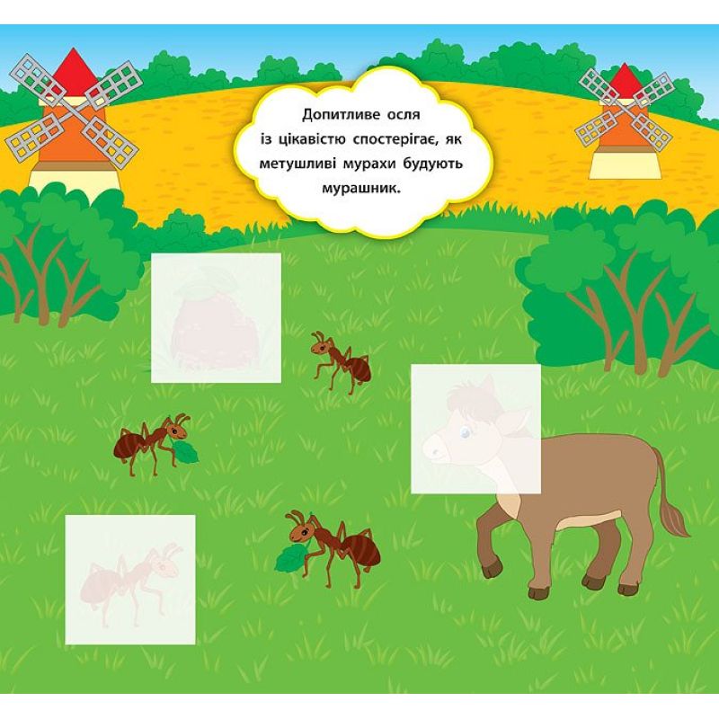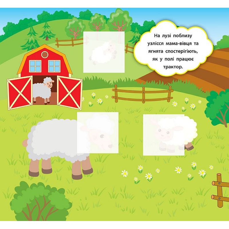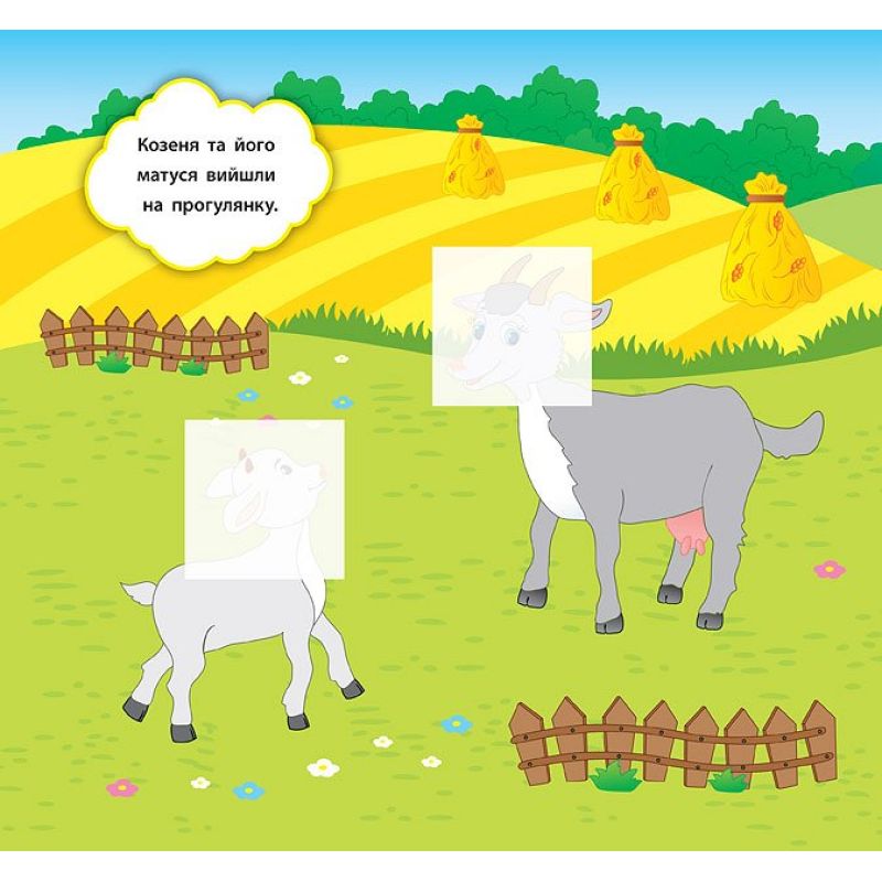 Ця книга познайомить дітей з багатьма свійськими тваринами: коровою, вівцею, конем, козою, віслюком та іншими. Також видання навчить малюків розрізняти поняття цілого та його частини. За допомогою фрагментів-наліпок дитина зможе доповнювати яскраві картинки, а короткі розповіді на кожній сторінці допоможуть батькам зацікавити малюка й стануть гарним поштовхом до створення власних історій.