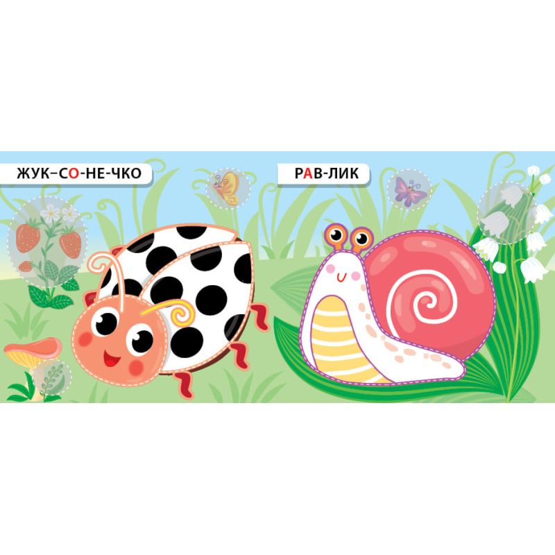 Ця книжка допоможе малюкам пізнавати навколишній світ. На її сторінках містяться великі малюнки комах, на яких потрібно навести пунктирні лінії та розфарбувати окремі елементи. Також діти зможуть вимовити по складах назви тварин і доповнити наліпками сторінки, що сприятиме розвитку мовлення, дрібної моторики пальців рук та більш різноманітній роботі з книжкою.