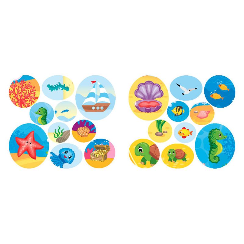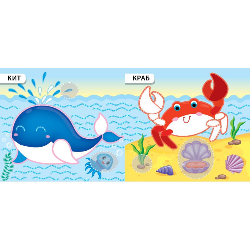 Ця книжка допоможе малюкам пізнавати навколишній світ. На її сторінках містяться великі малюнки морських мешканців, на яких потрібно навести пунктирні лінії та розфарбувати окремі елементи. Також діти зможуть вимовити по складах назви тварин і доповнити наліпками сторінки, що сприятиме розвитку мовлення, дрібної моторики пальців рук та більш різноманітній роботі з книжкою.