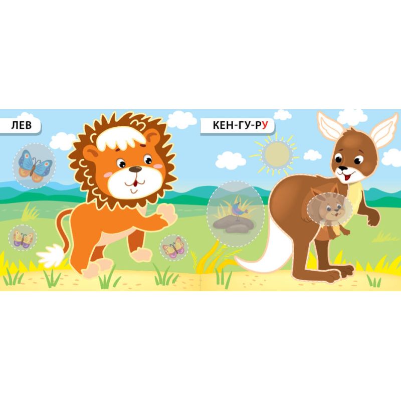 Ця книжка допоможе малюкам пізнавати навколишній світ. На її сторінках містяться великі малюнки екзотичних тварин, на яких потрібно навести пунктирні лінії та розфарбувати окремі елементи. Також діти зможуть вимовити по складах назви тварин і доповнити наліпками сторінки, що сприятиме розвитку мовлення, дрібної моторики пальців рук та більш різноманітній роботі з книжкою.