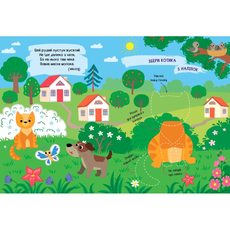 У цьому виданні дитина познайомиться зі свійськими тваринами, відгадає загадки про них і збере їх з наліпок, користуючись підказками.