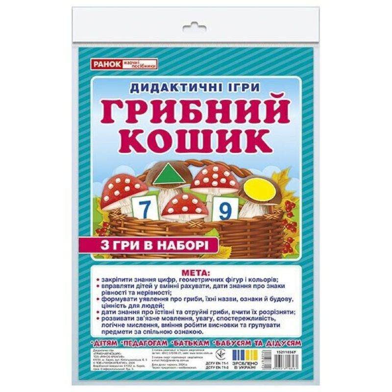 Вчимося збирати гриби, граючи. Діти дізнаються про види грибів, навчаться розрізняти їстівні та отруйні. Такі дидактичні ігри можна використовувати під час тематичних тижнів про осінь, на уроках математики і на позакласних заняттях за рекомендацією НУШ. Набір підійде для роботи вчителів початкової школи та вихователів, а також для самостійних занять удома. У наборі 2 поля для гри (формат 30х21 см), 24 картки, методичні рекомендації. Всі складові з целюлозного картону. Розрахований на багаторазове використання.