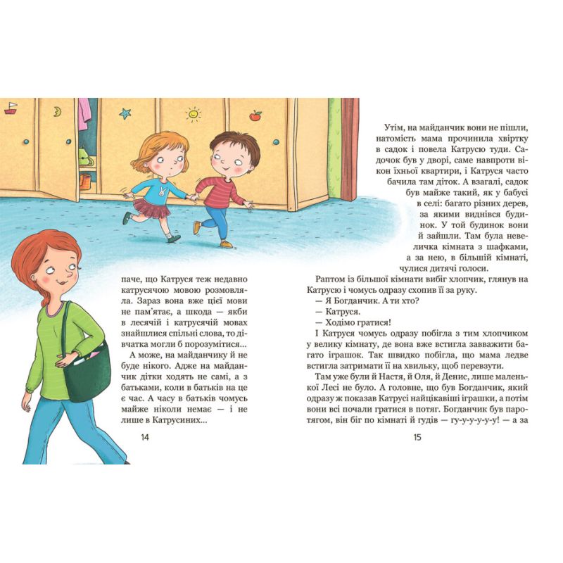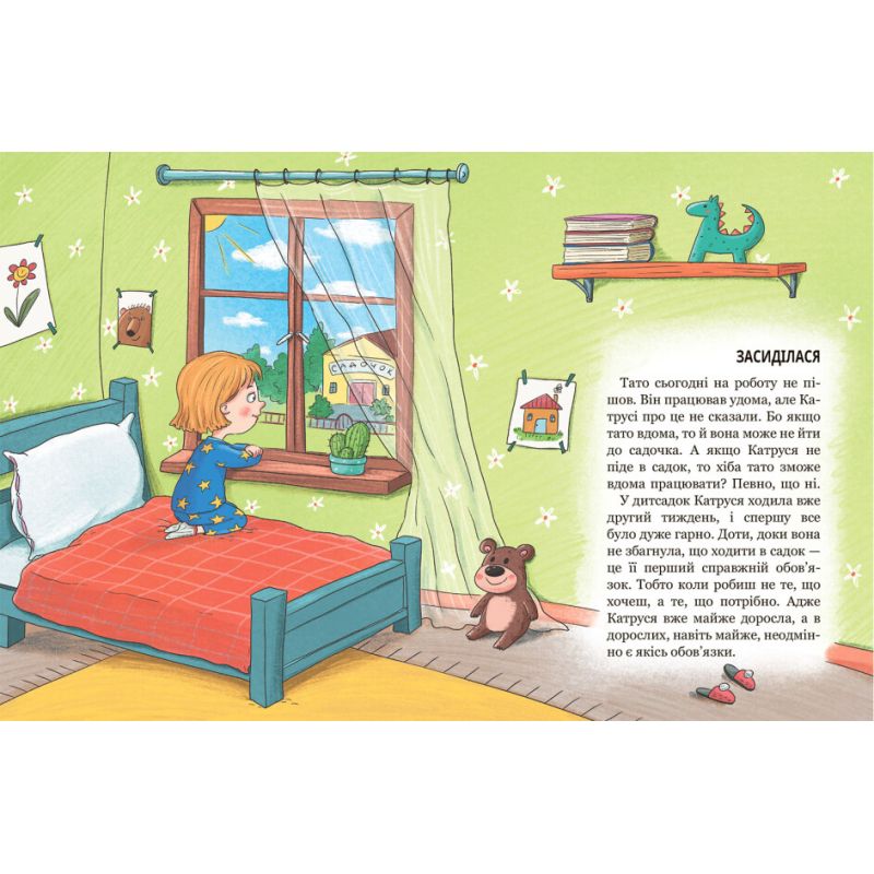 Трирічна Катруся вперше йде до дитячого садочка. Їй дуже цікаво: адже там багато діточок, із якими можна погратися досхочу. Та коли відвідування садочка стає справжнім обов’язком, коли трапляються перші розчарування, прикрощі, капості й навіть конфлікти — тоді треба вперше в житті показати характер і нікому не дозволити «плювати собі в кашу»… Обов’язково прочитайте своєму дошкільняткові цю книжку, в якій напрочуд легко, правдиво й весело оповідається про перші кроки в дитячому садку, про труднощі й радощі дитячих взаємин.