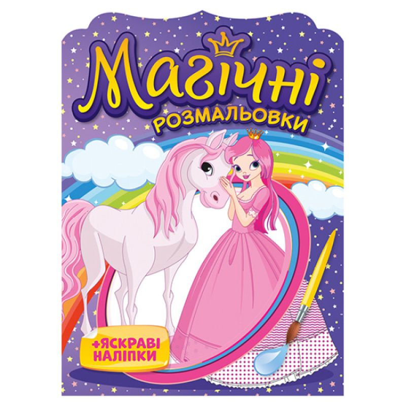 Книжечка-розмальовка з яскравими наліпками для дівчаток. Тематика її це казкові принцеси, принци, білий кінь та все те, що полюбляють маленькі мрійниці. Розмальовуємо малюнки без фарб та олівців, лише звичайною водою та пензликом! Справиться кожен. Малюнків у наборі 8.