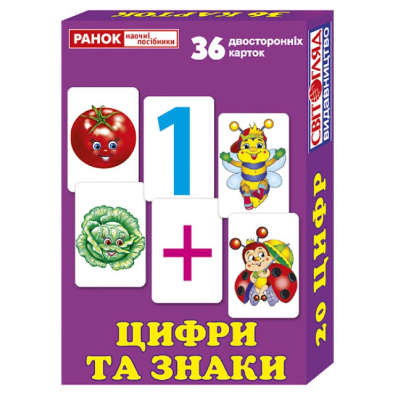 - Роздавальний матеріал "Цифри та знаки"Пропонуємо вам набір із 36 двосторонніх карток із зображеннями цифр, математичних ..