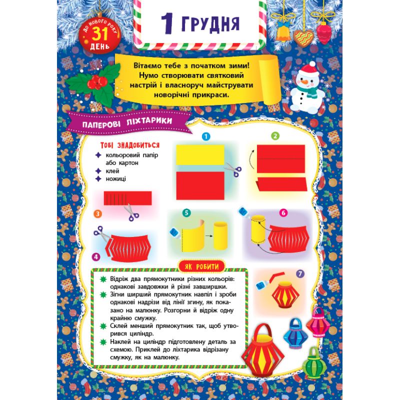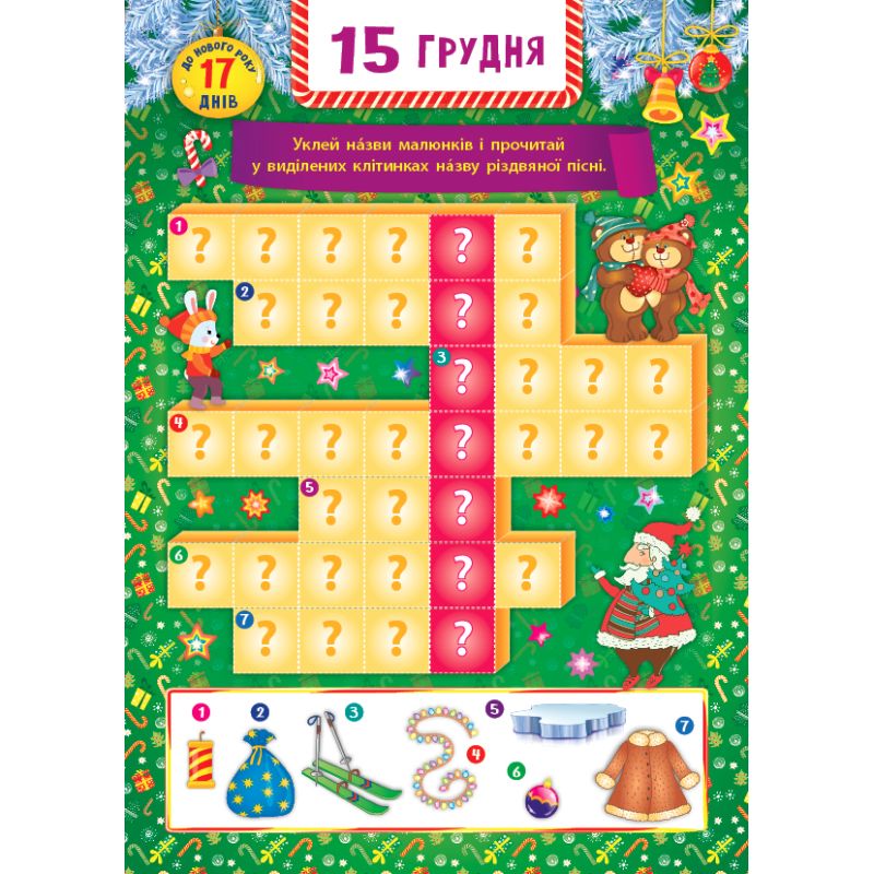 Разом із цією книжкою малюк підготується до зимових свят та проведе час в очікуванні Нового року цікаво та з користю. Видання містить великий плакат-календар на грудень, творчі й розвивальні завдання на кожен день місяця, 230 яскравих наліпок для виконання завдань і заповнення календаря, а також лист святому Миколаю та лист для планів на наступний рік.