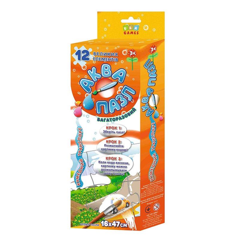 Гра призначена для малюків від 3-х років. Вона спрямована на розвиток дрібної моторики пальців, логічного мислення та уяви. Гра полягає в тому, що дитина збирає 12 великих пазлів у єдине зображення, яке перетворюється у багаторазову розмальовку. Після цього вона мокрим пензликом змочує місця на пазлі, які виділені білим кольором. Коли вода висохне, малюнок зникне, тому його можна використовувати знову і знову!