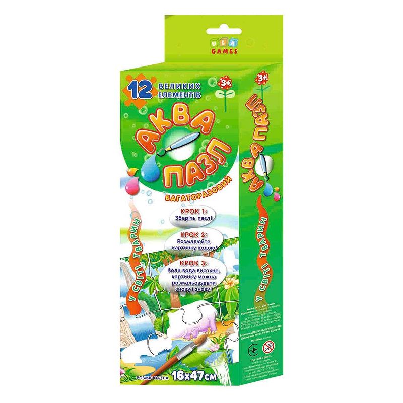 Гра призначена для малюків від 3-х років. Вона спрямована на розвиток дрібної моторики пальців, логічного мислення та уяви. Гра полягає в тому, що дитина збирає 12 великих пазлів у єдине зображення, яке перетворюється у багаторазову розмальовку. Після цього вона мокрим пензликом змочує місця на пазлі, які виділені білим кольором. Коли вода висохне, малюнок зникне, тому його можна використовувати знову і знову!