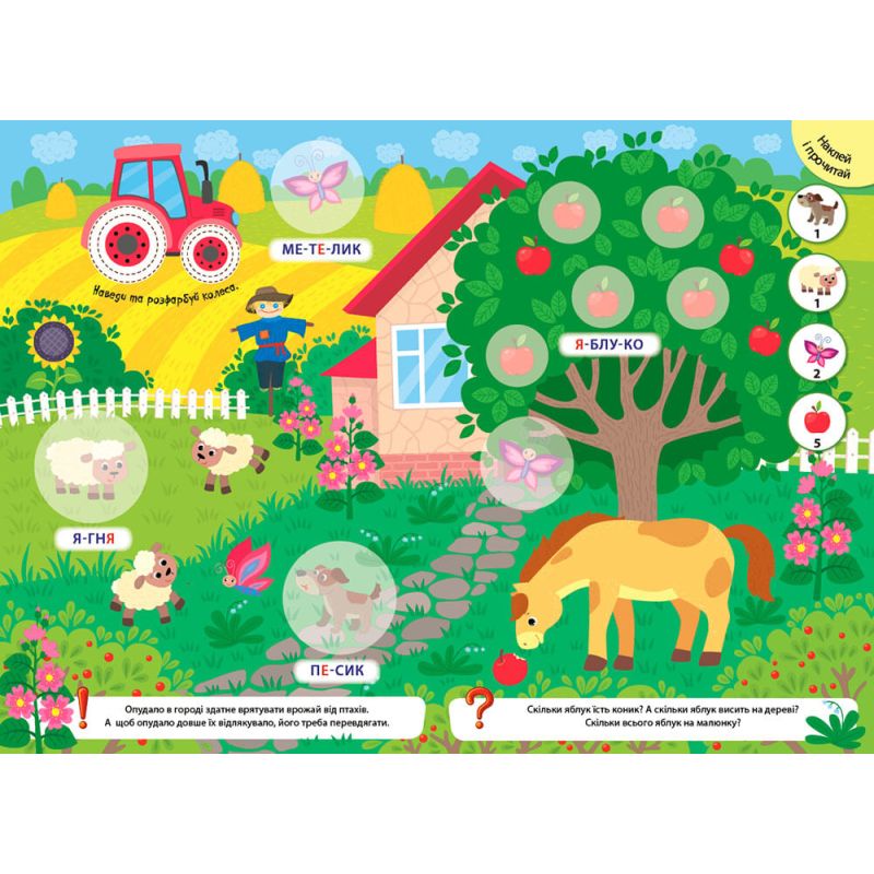 У цьому виданні дитина познайомиться зі свійськими й дикими тваринами та дізнається цікаві факти про них, повправляється в лічбі й читанні, наведе та розфарбує окремі предмети на малюнках, навчиться правильно визначати колір, форму й розмір, виконає розвивальні завдання, а також потренує увагу та дрібну моторику.