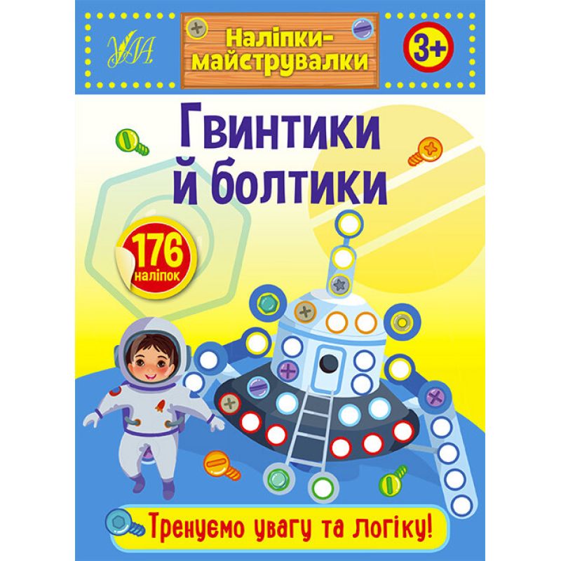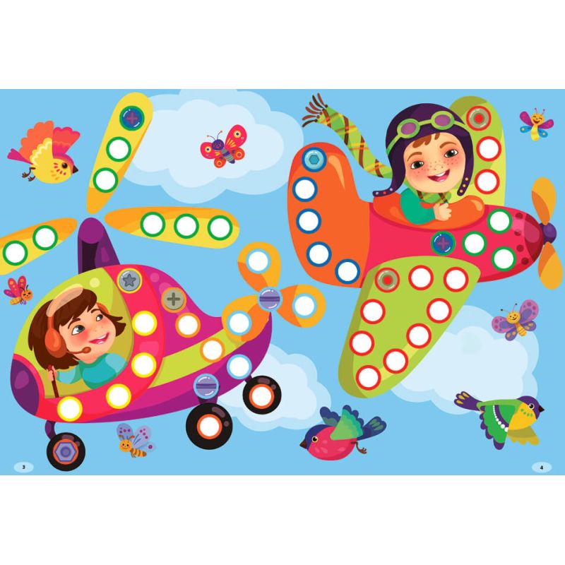 Видання містить 176 наліпок – різнокольорових гвинтиків і болтиків. Дитина має доповнити за їхньою допомогою картинки: вклеїти їх у порожні кружечки за зразком. Колір контура наліпок послугує малюкові підказкою.